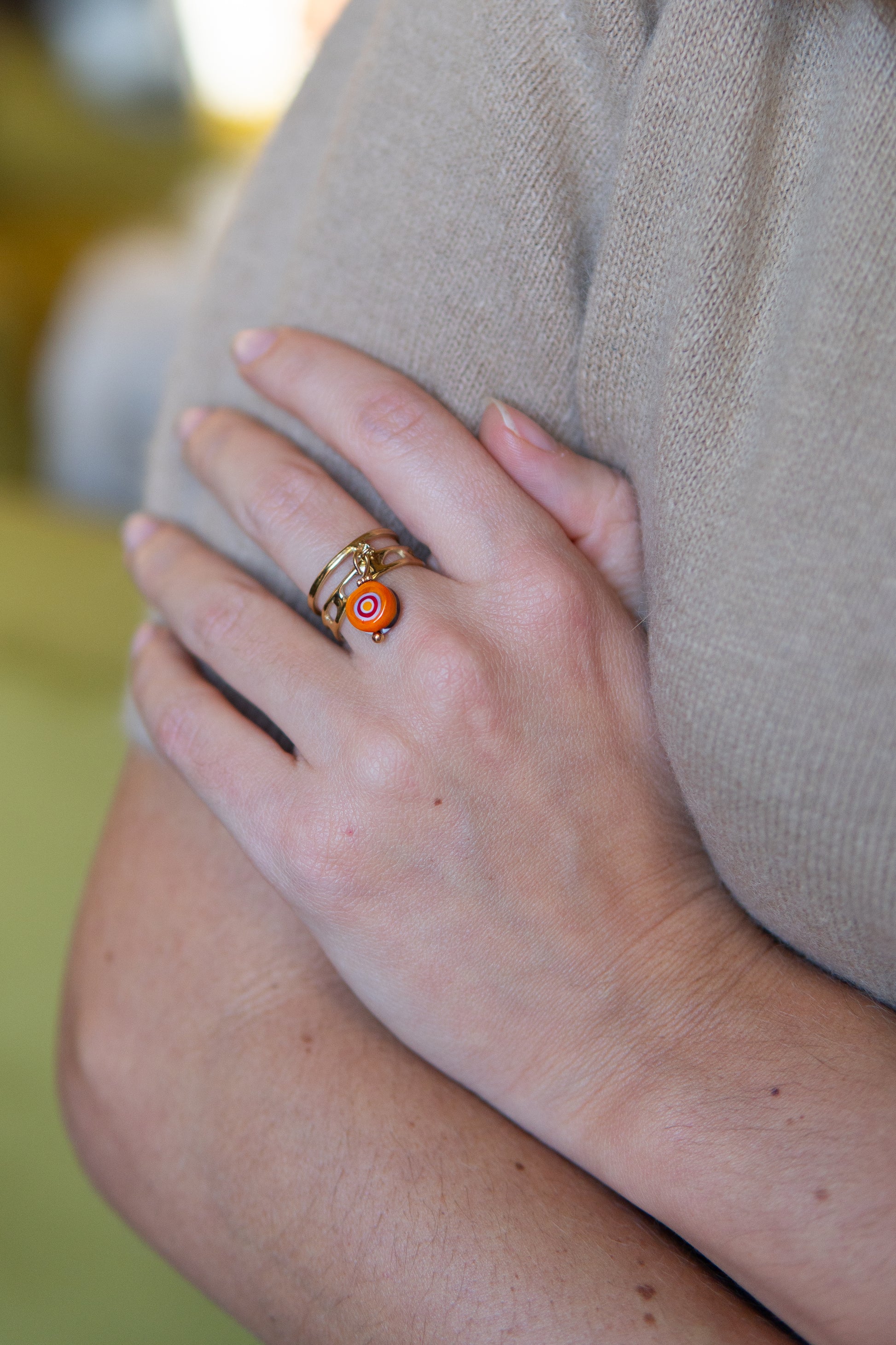 Anello Bunigòlo. Bunigòlo, ombelico, è un anello dal design dorato e contemporaneo che avvolge il dito con due fasce luminose che si incontrano al centro, dove una murrina a due facce diverse, diventa il fulcro del gioiello. Bunigòlo è un anello compatto ma pieno di carattere, perfetto per aggiungere un tocco di luce e personalità anche al look più semplice. Da indossare da solo come protagonista, o insieme ad altri anelli per un effetto più ricco e contemporaneo. L'anello è regolabile.