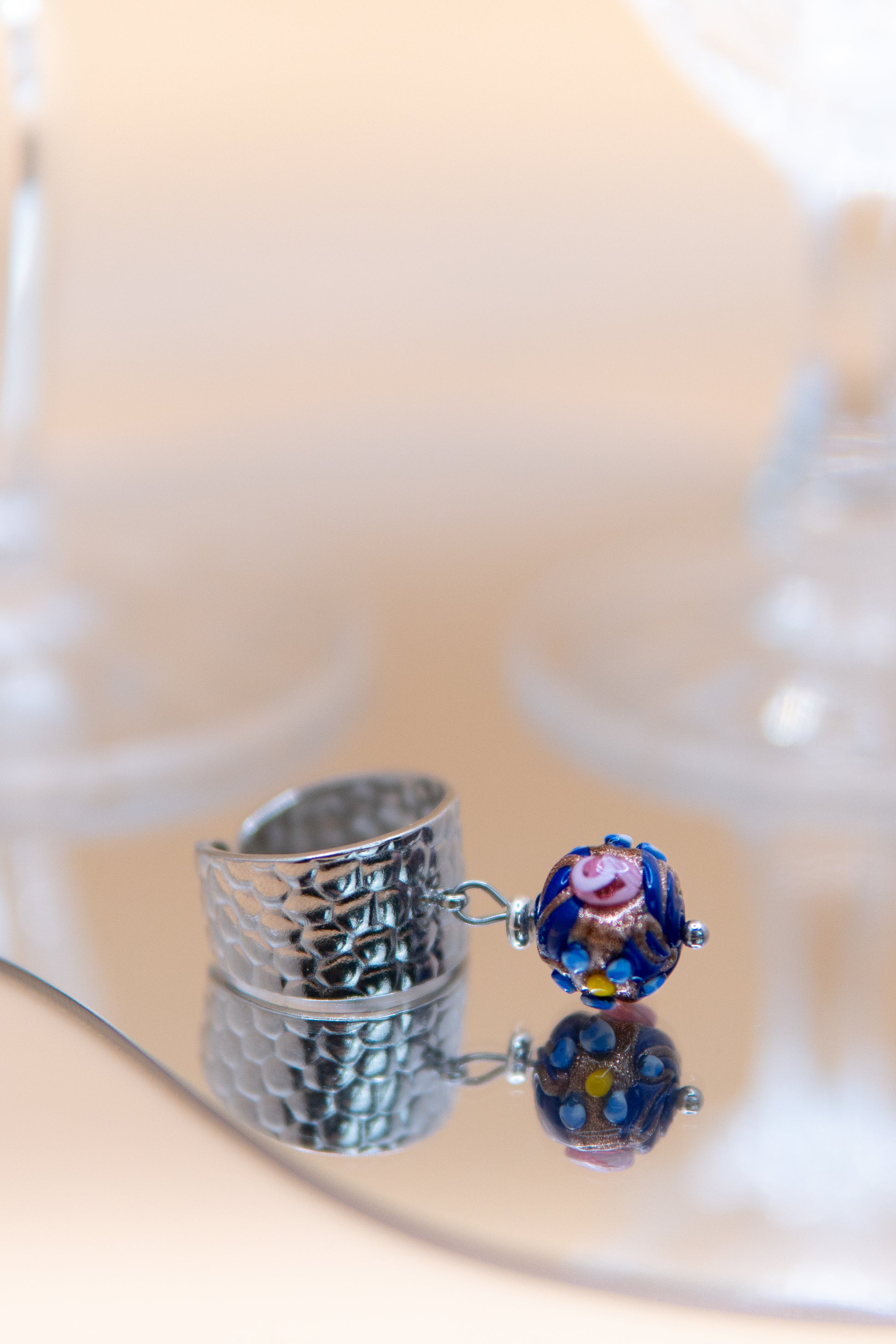 Anello Mini Delissia. Mini Delissia, piccola delizia ,è un anello che unisce essenzialità e fantasia in un gesto di stile prezioso. La fascia argentata, dal design martellato, avvolge il dito con una presenza luminosa e raffinata, diventando la cornice ideale per il charm che lo completa. Il piccolo pendente è una perla tonda in vetro veneziano, decorata con delicati motivi floreali in rilievo: minuscoli fiori modellati a mano che rendono ogni pezzo prezioso ed estremamente riconoscibile. Ogni dettaglio racconta la cura, il gesto artigianale e quella poetica imperfezione che è la firma del fatto a mano.