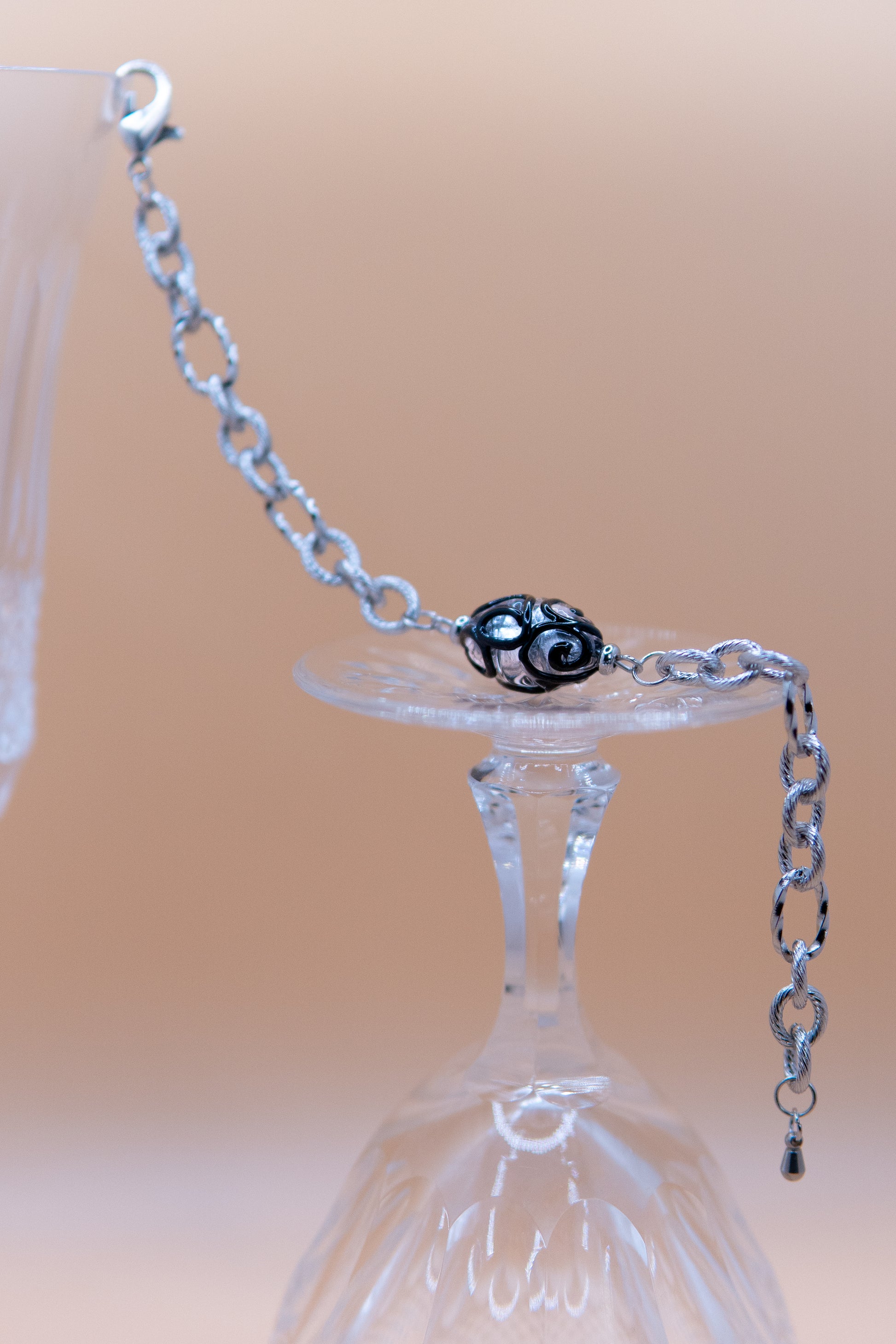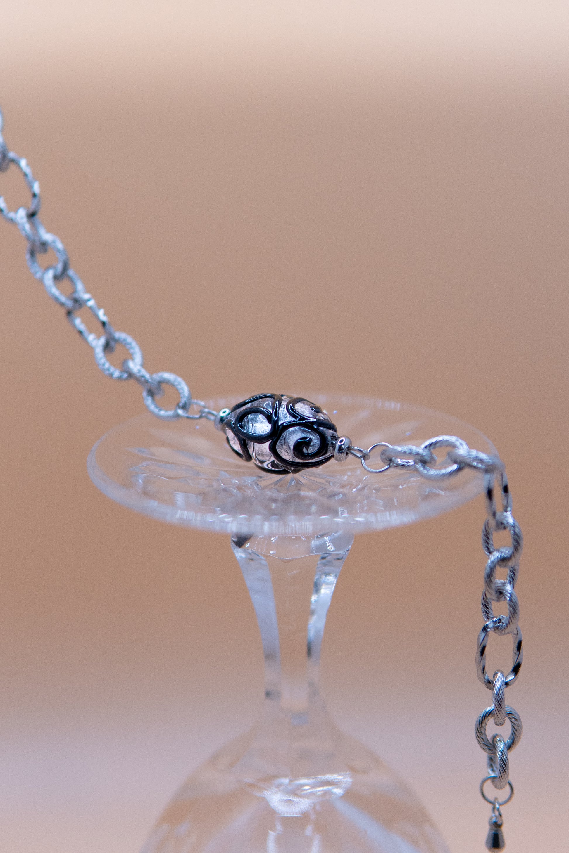 Composto da: perla in vetro di forma ovale - con foglia d'argento sommersa e spirali monocolore neri in rilievo - lavorazione a lume - finitura lucida; pendente in acciaio inossidabile color argento a forma di fiore.