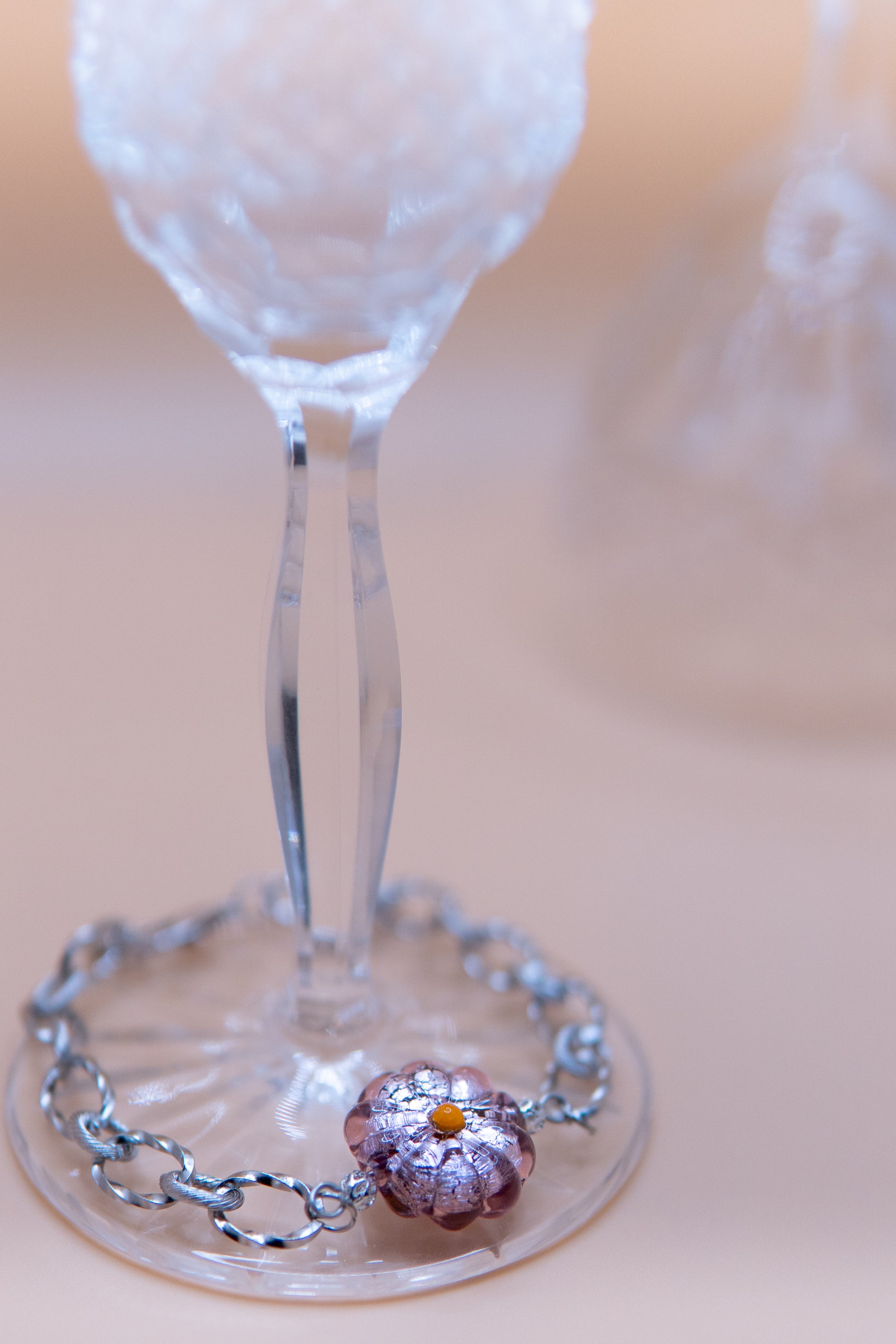 Bracciale Basétto. Basètto, bacetto, è un piccolo fiore di vetro da portare al polso. La catena argentata, con le sue maglie intrecciate e luminose, crea un gioco di luci discreto e moderno che incornicia perfettamente il pendente. La perla centrale, lavorata come un bocciolo di vetro veneziano, è caratterizzata da una delicata sfumatura lilla che si illumina grazie alla foglia d’argento interna. Al centro, un piccolo punto aranciato aggiunge calore e vivacità, come il cuore di un fiore che si apre alla luce. L’effetto complessivo è poetico e raffinato: un gioiello dall’eleganza quieta, capace di impreziosire anche i look più semplici con un tocco di colore tenue e brillantezza morbida.
