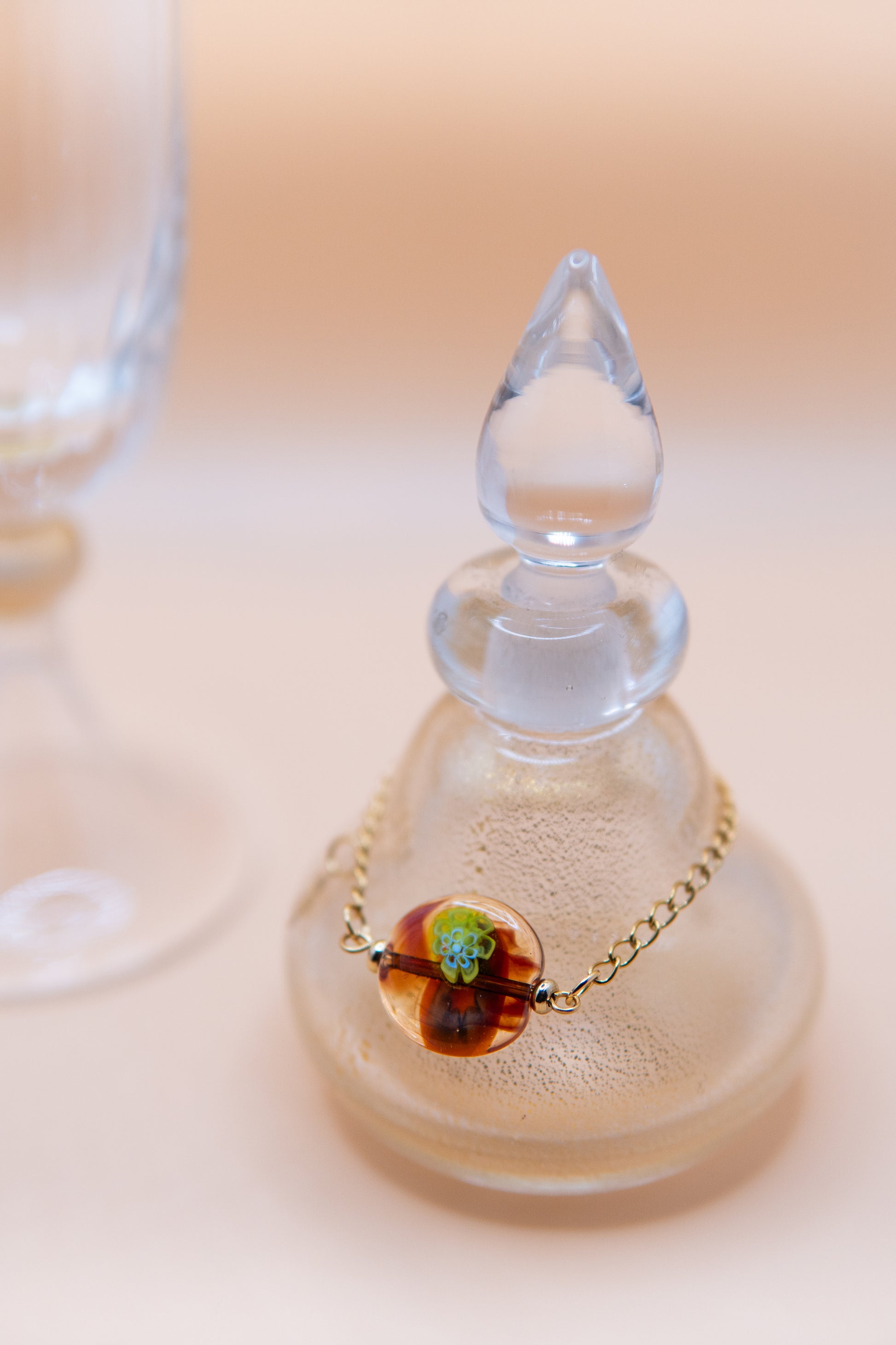 Bracciale Momòn. Momòn, vezzeggiativo veneziano per “ caramella ”, è un bracciale che conquista con la sua dolce semplicità. La catena dorata è intervallata da una perla con murrine colorate e da un delicato ciondolino dorato che aggiunge un tocco di movimento e luce. Una piccola dolcezza artigianale da indossare: semplice ma prezioso, Momòn è il bracciale perfetto da portare da solo per un look pulito, oppure insieme ad altri bracciali per un effetto ancora più ricco e personale.