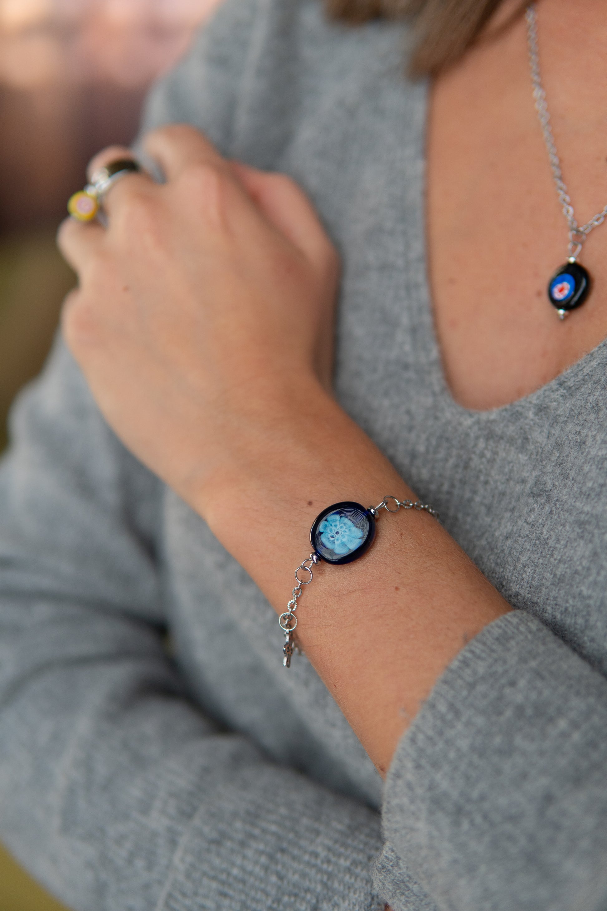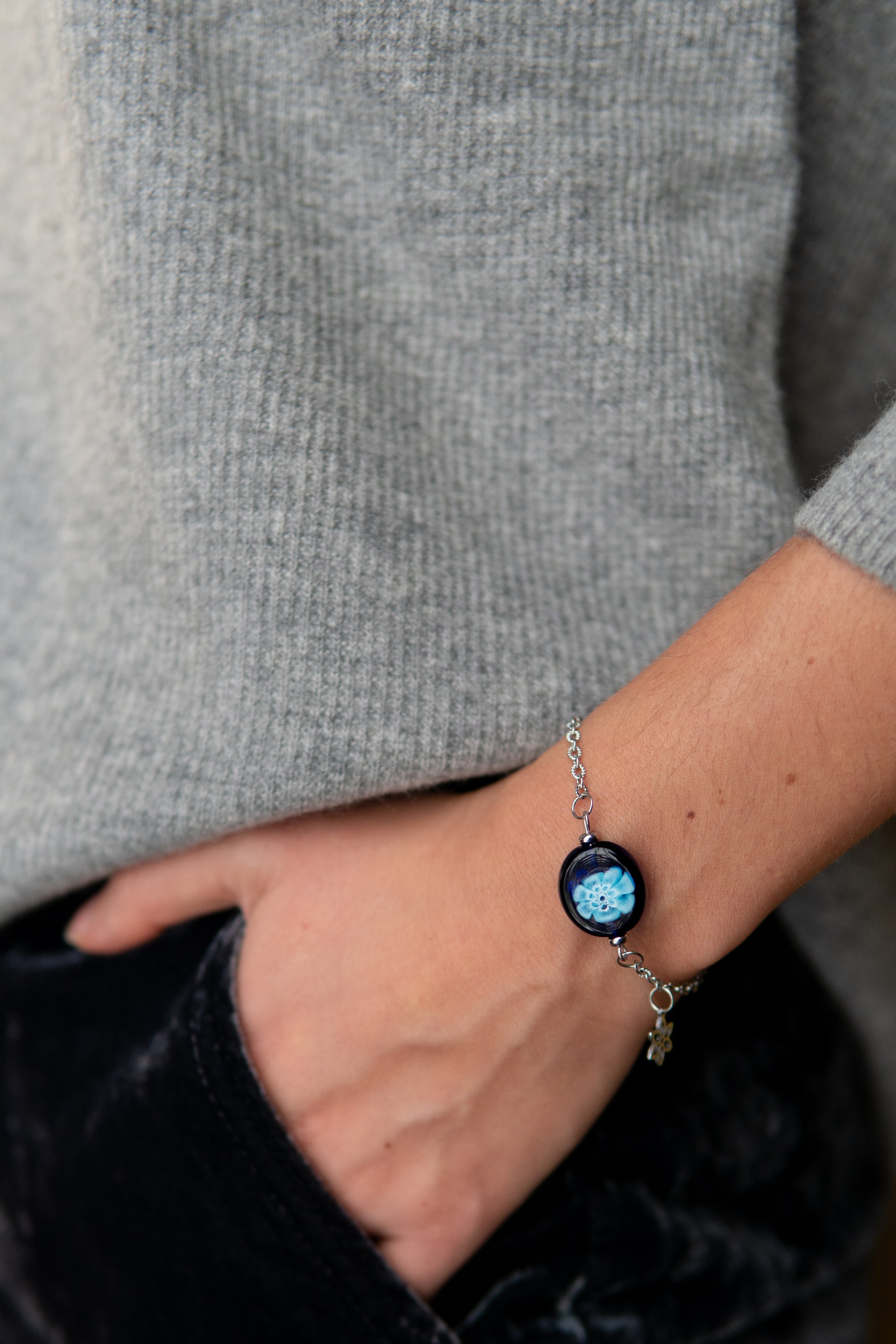 Bracciale Momòn. Momòn, vezzeggiativo veneziano per “ caramella ”, è un bracciale che conquista con la sua dolce semplicità. La catena argentata è intervallata da una perla con murrine colorate e da un delicato ciondolino argentato che aggiunge un tocco di movimento e luce. Una piccola dolcezza artigianale da indossare: semplice ma prezioso, Momòn è il bracciale perfetto da portare da solo per un look pulito, oppure insieme ad altri bracciali per un effetto ancora più ricco e personale.