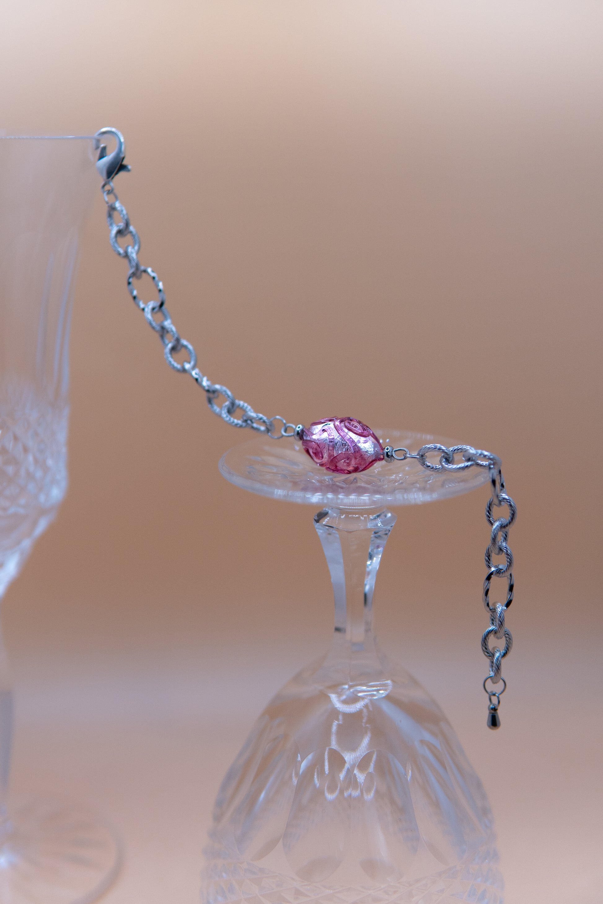 Composto da: perla in vetro di forma ovale - con foglia d'argento sommersa e spirali monocolore rosa in rilievo - lavorazione a lume - finitura lucida; pendente in acciaio inossidabile colore argento a forma di fiore.