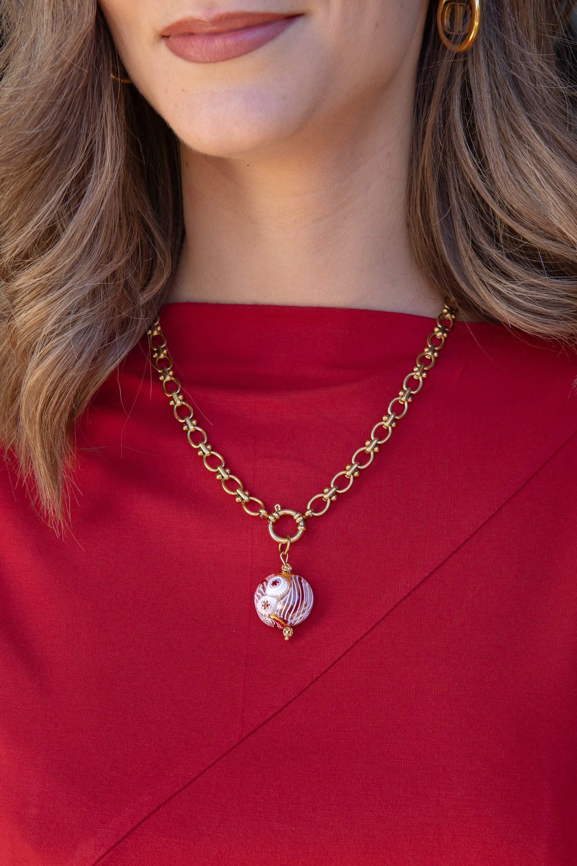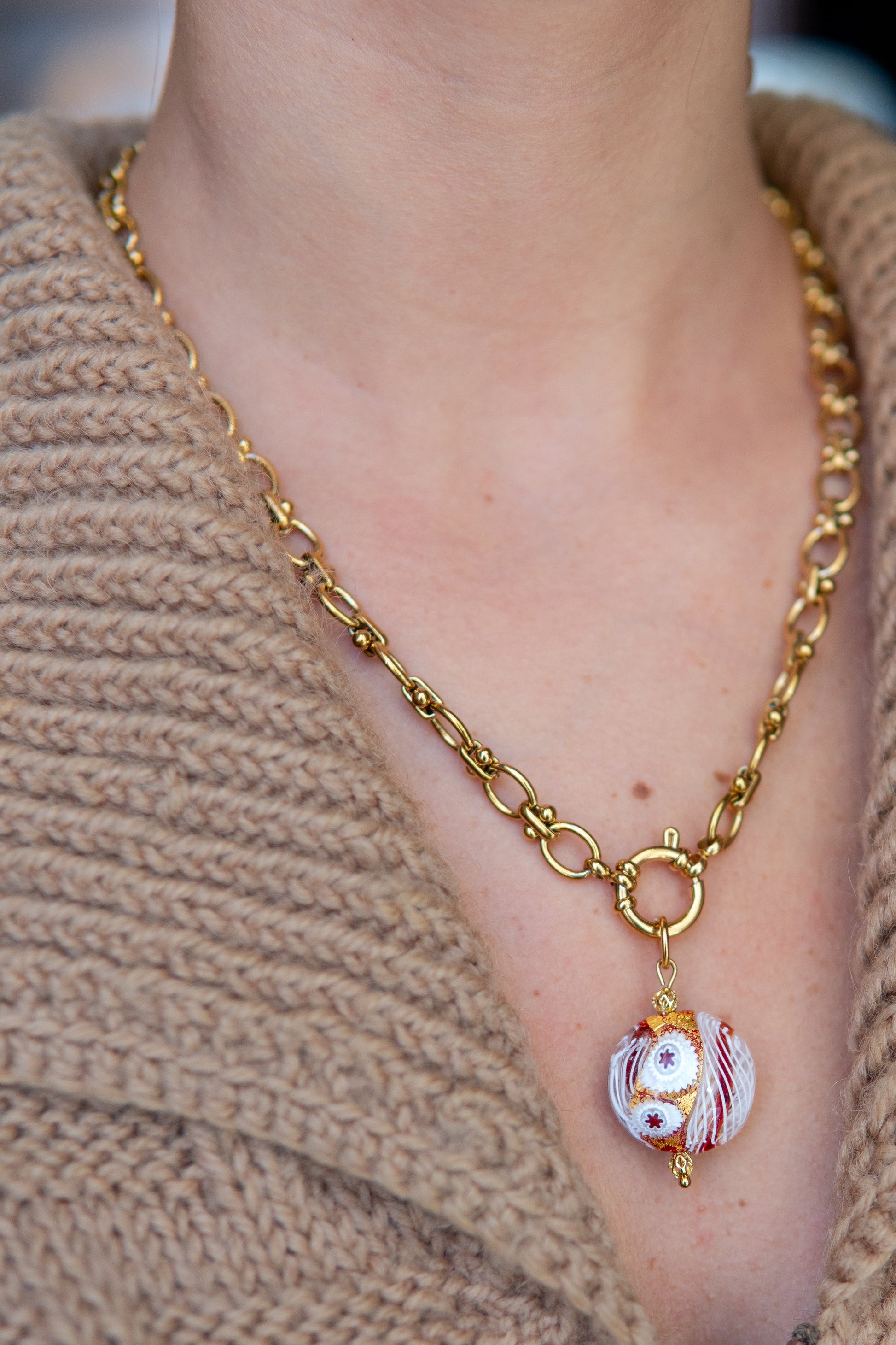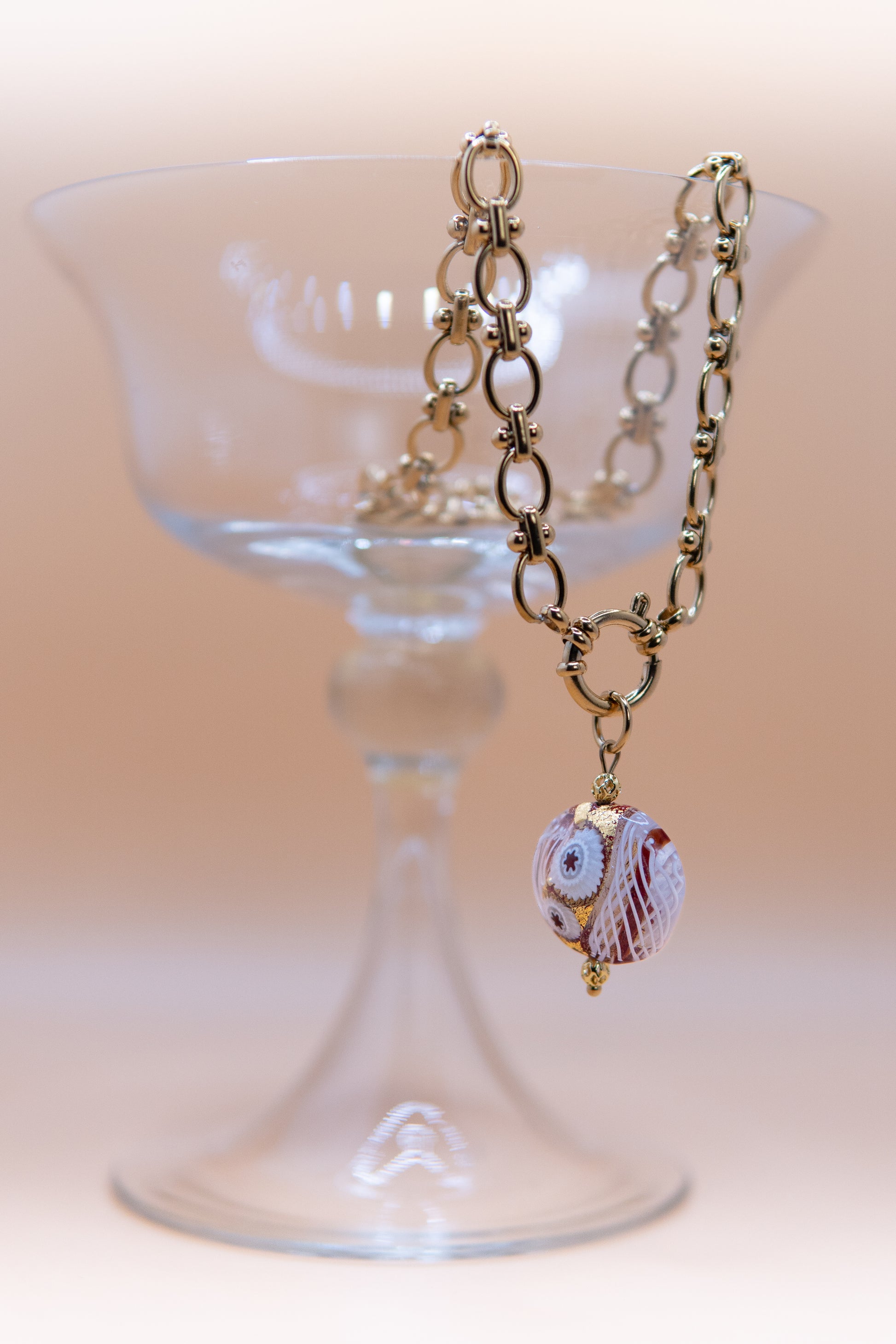 Collana Filò d’Oro. Filò d'oro, filo d'oro, è un omaggio alla maestria più alta della tradizione muranese. La catena dorata, lavorata con maglie irregolari e lucenti, scorre morbida lungo il décolleté e incornicia una perla che è una vera opera d’arte. Il pendente, una sfera in vetro realizzata con la tecnica del reticello, rappresenta una delle lavorazioni più complesse e affascinanti dell’arte vetraria. Le canne intrecciate “a redexelo” o “a redexin” creano una trama finissima di fili bianchi e rossi che sembrano danzare in sospensione all’interno del vetro. Le piccole murrine floreali arricchiscono ulteriormente la superficie, rendendo ogni lato della perla un microcosmo prezioso.