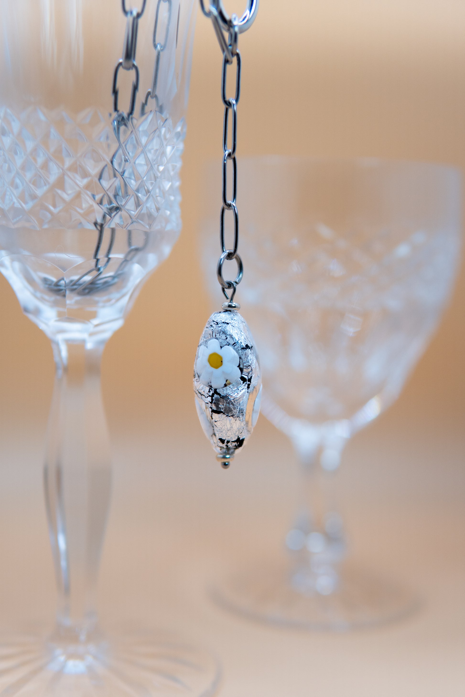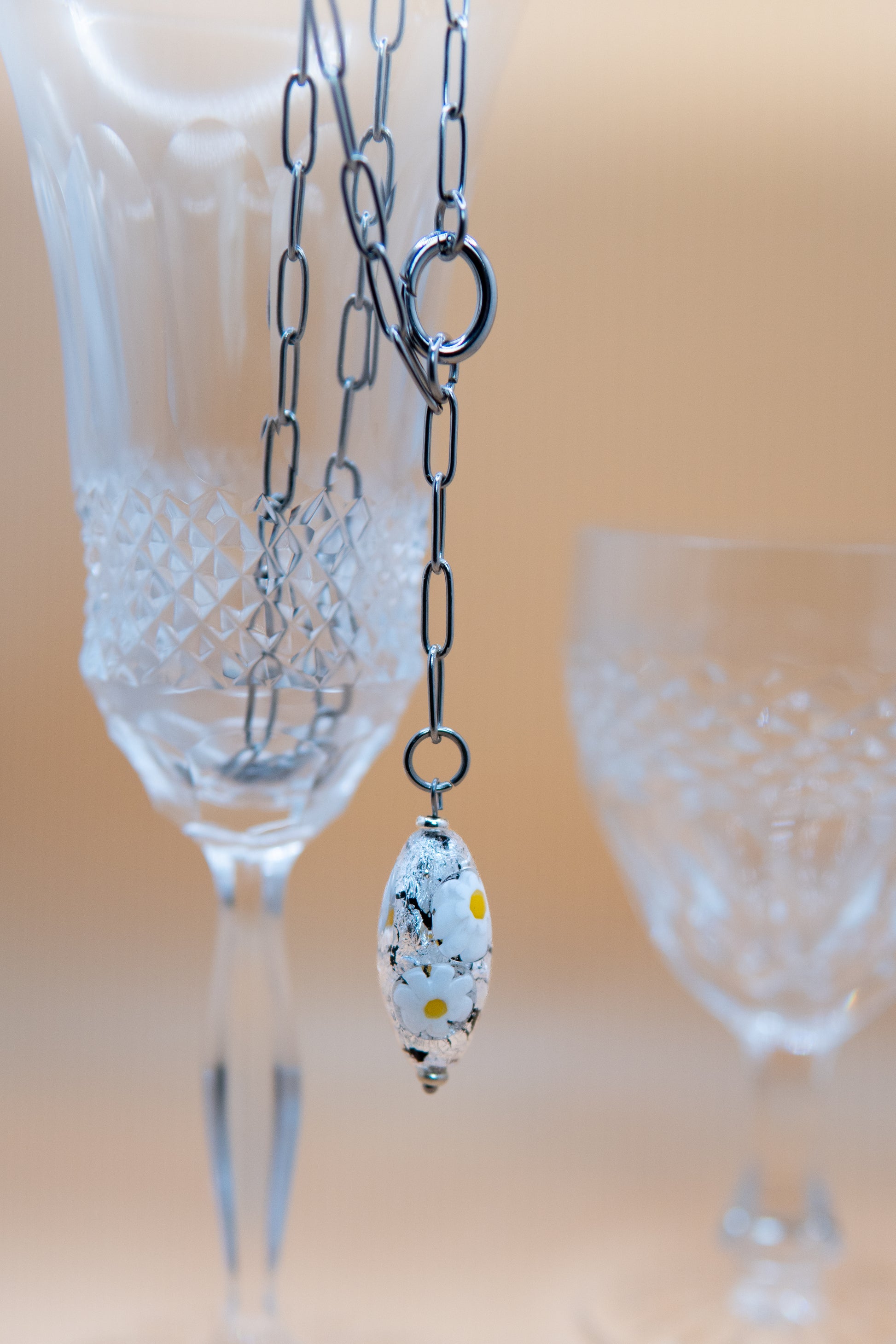 Composta da: perla in vetro a lume - forma ovale allungata - foglia d'argento e mosaico - finitura lucida - due componenti in acciaio inossidabile ai lati della perla.
