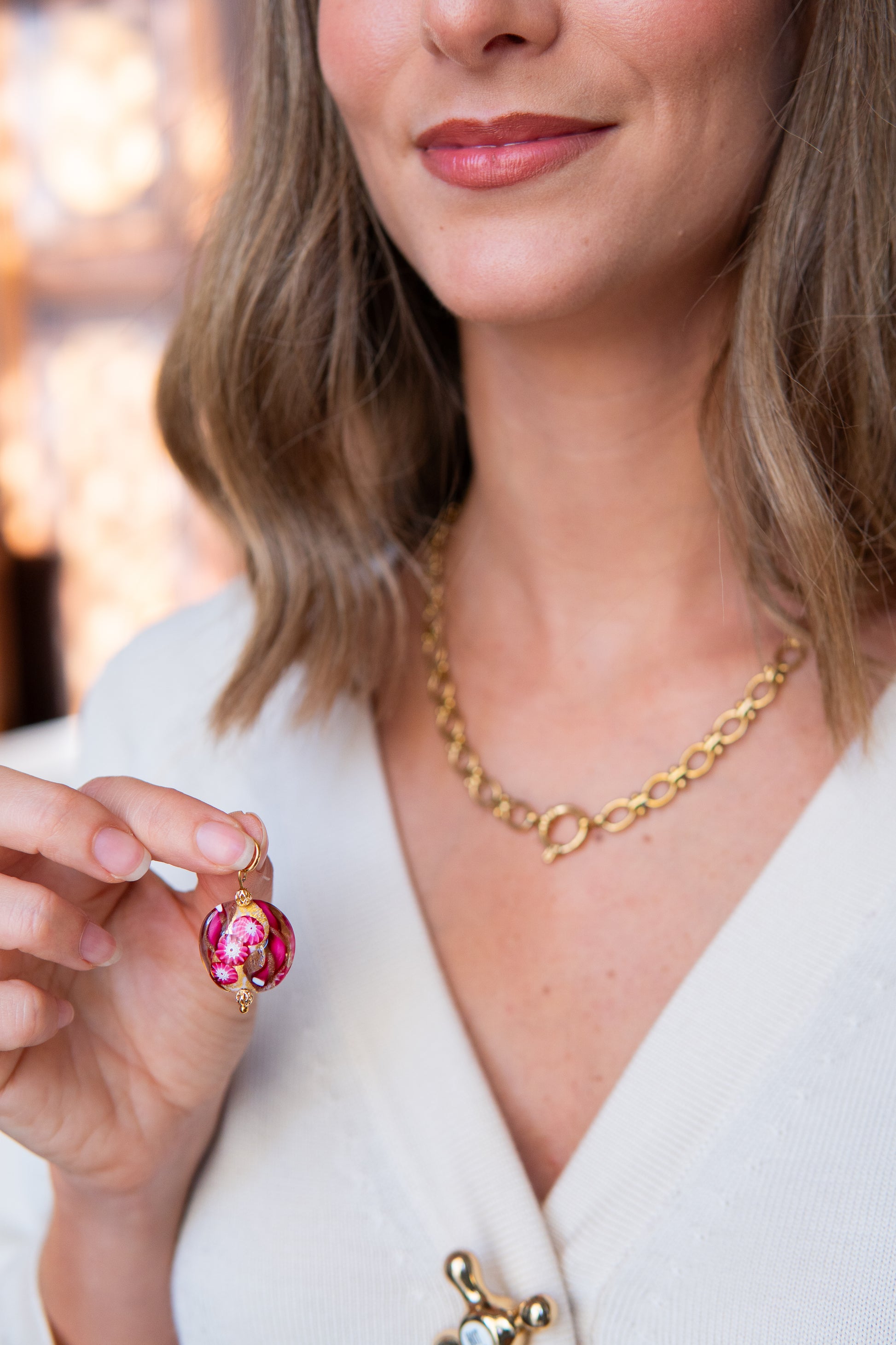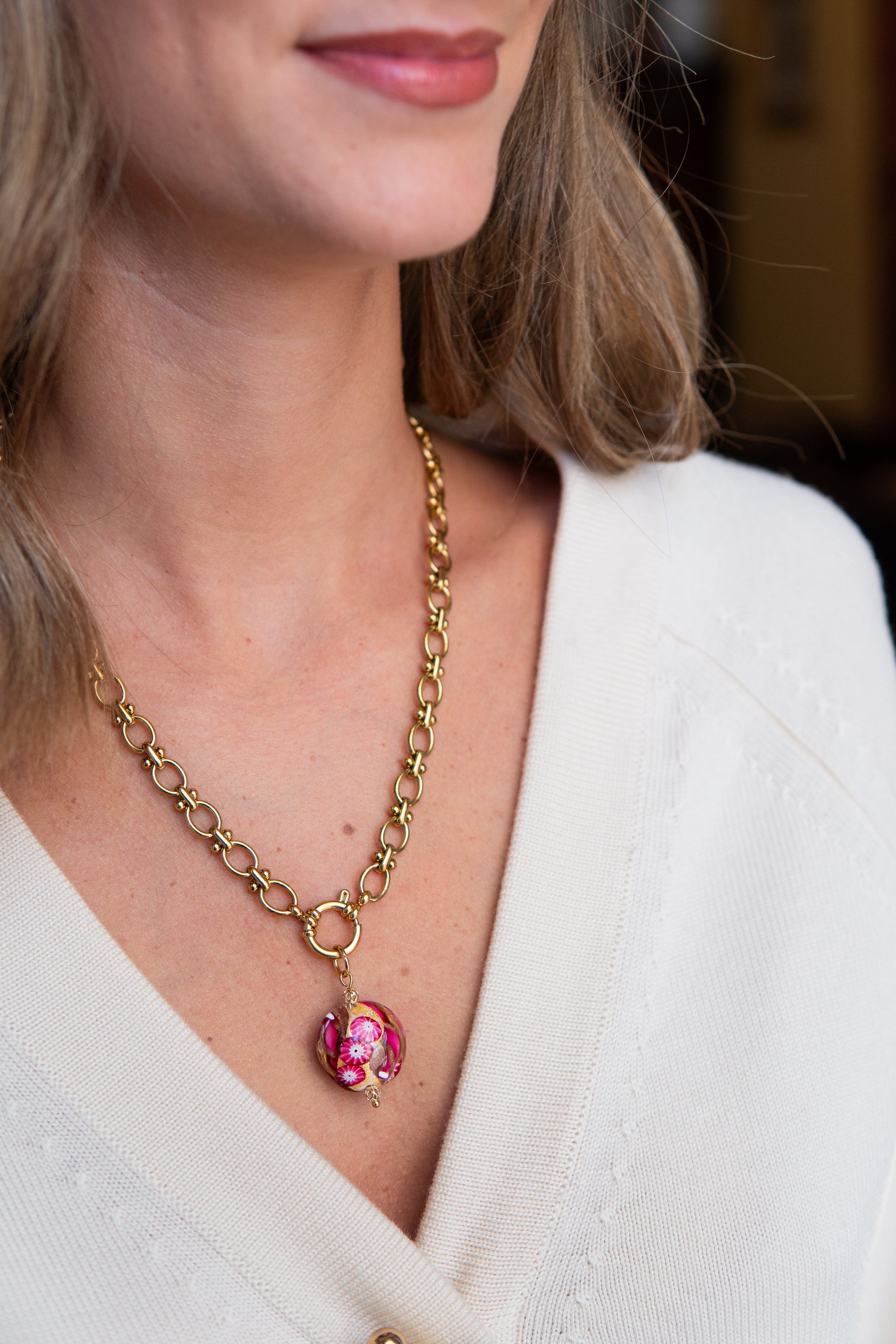 Collana Lùssera. Lùssera, luccicare: un nome che racconta la sua essenza, fatta di luce e movimento. Questa collana dorata dal carattere deciso unisce una catena importante ad una perla in vetro di Murano lavorata a mano, dove si intrecciano sfumature rosate, tocchi dorati e piccole murrine floreali. La perla racchiude un gioco di riflessi cangianti che cambiano con la luce e con il gesto, come se l’acqua della laguna si trasformasse in vetro. Lùssera è pensata per chi ama i dettagli che raccontano: illumina con naturalezza un maglione chiaro, una camicia bianca o un abito essenziale, aggiungendo un accento di calore e femminilità. La lavorazione di questa perla, è tra le più complesse dell'arte vetraria: canne intrecciate “a redexelo” o “a redexin”, tecnica nota come reticello. Il reticello, ideato a Murano intorno alla metà del Cinquecento, è considerato ancora oggi una delle tecniche più difficili da eseguire.