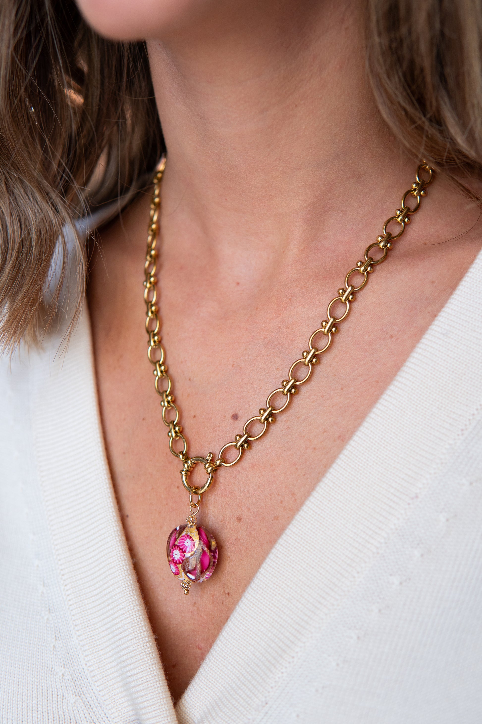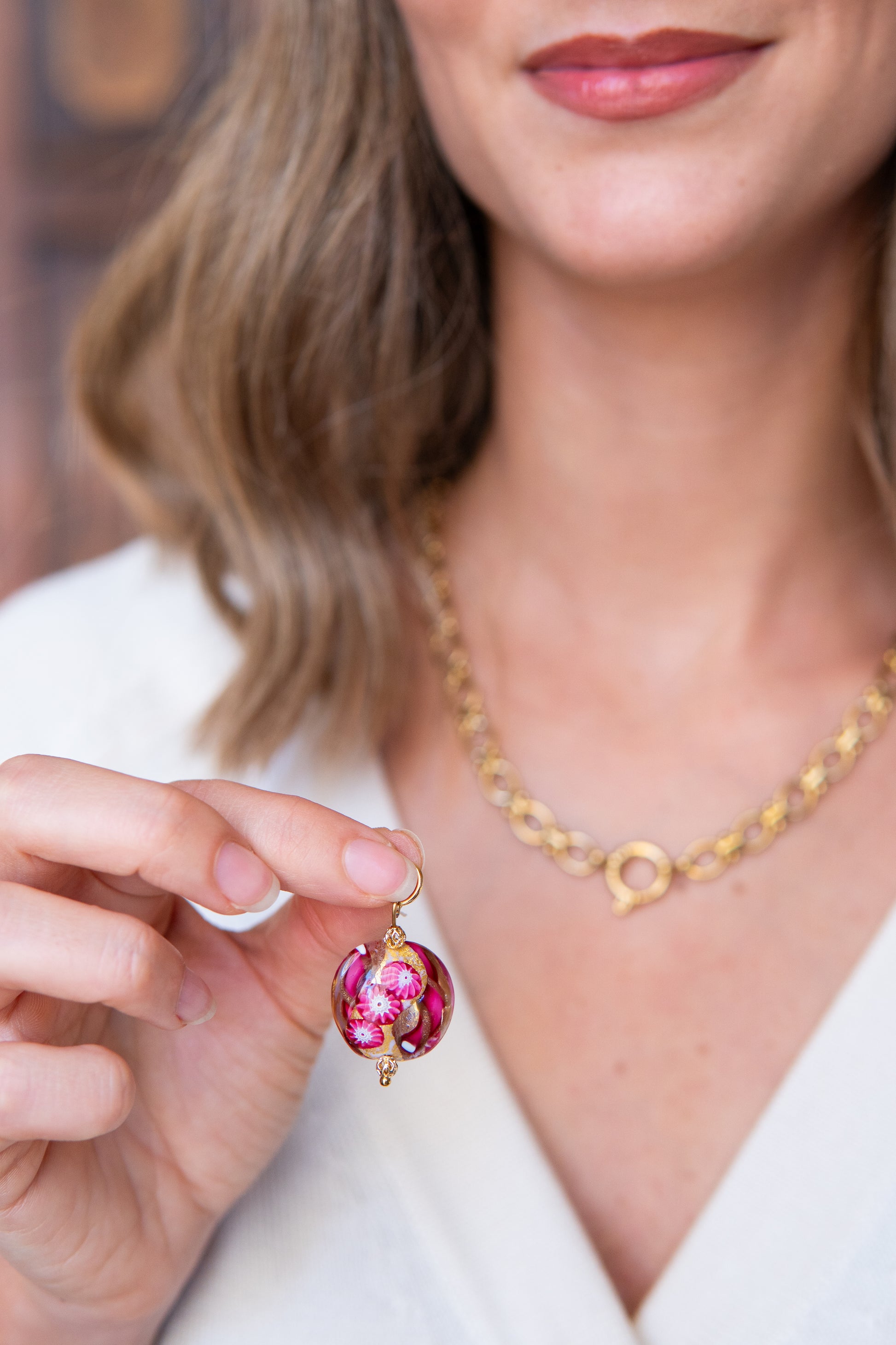 Composta da perla in vetro di forma lenticolare - con murrine floreali - foglia d'oro - filigrana rosa - finitura lucida - due componenti in acciaio inossidabile ai lati della perla.
