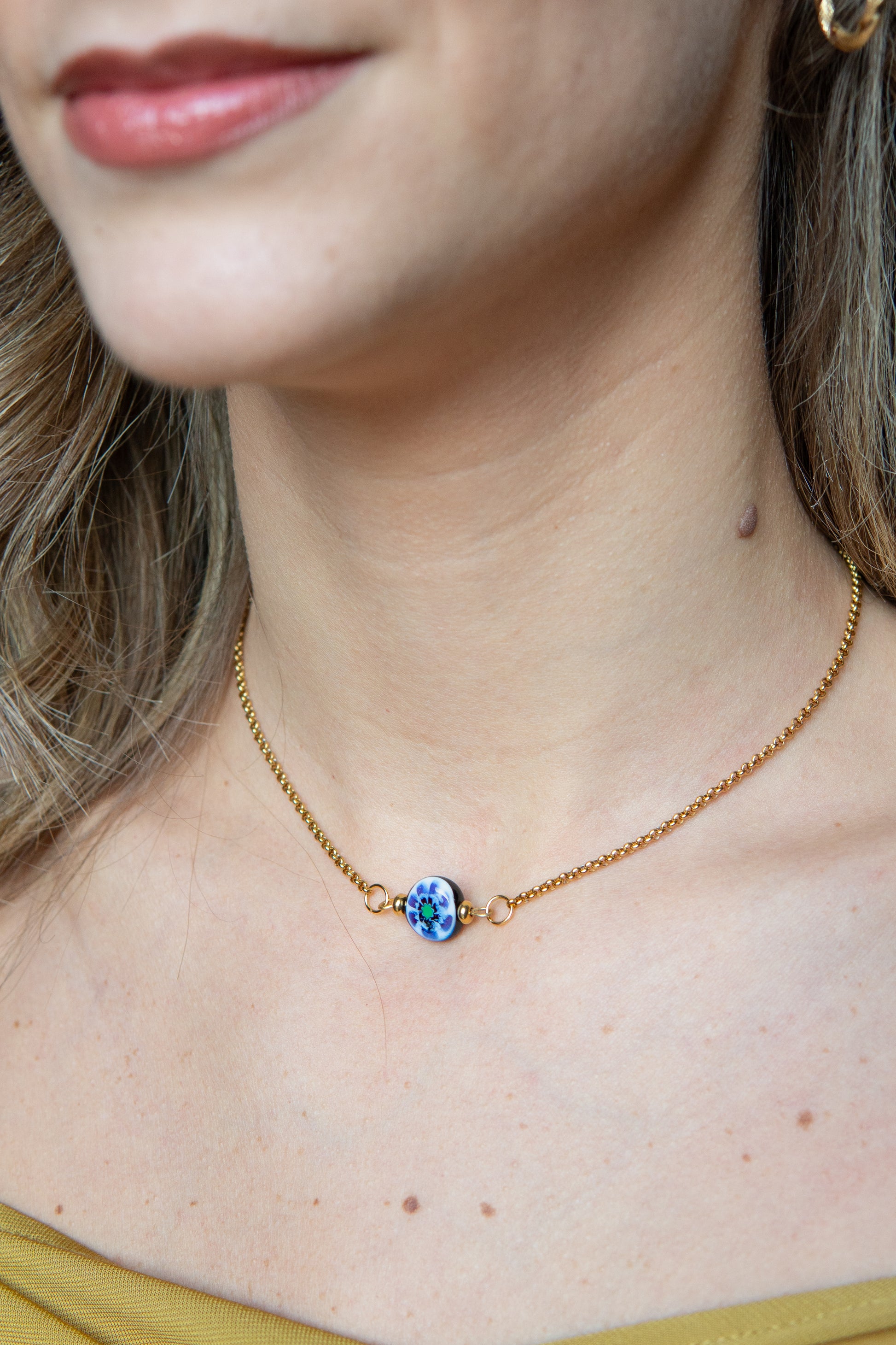 Collana Òcièto Rosso. Òcièto, occhietto, è un nome affettuoso per una collana dal fascino discreto. La catenina dorata, sottile e luminosa, è incorniciata da una perlina che cattura pur nella sua semplicità. Un gioiello che si indossa con leggerezza, che si lascia notare anche su una scollatura semplice, un maglione girocollo o un collo nudo, come un dettaglio silenzioso ma capace di attirare lo sguardo al momento giusto.