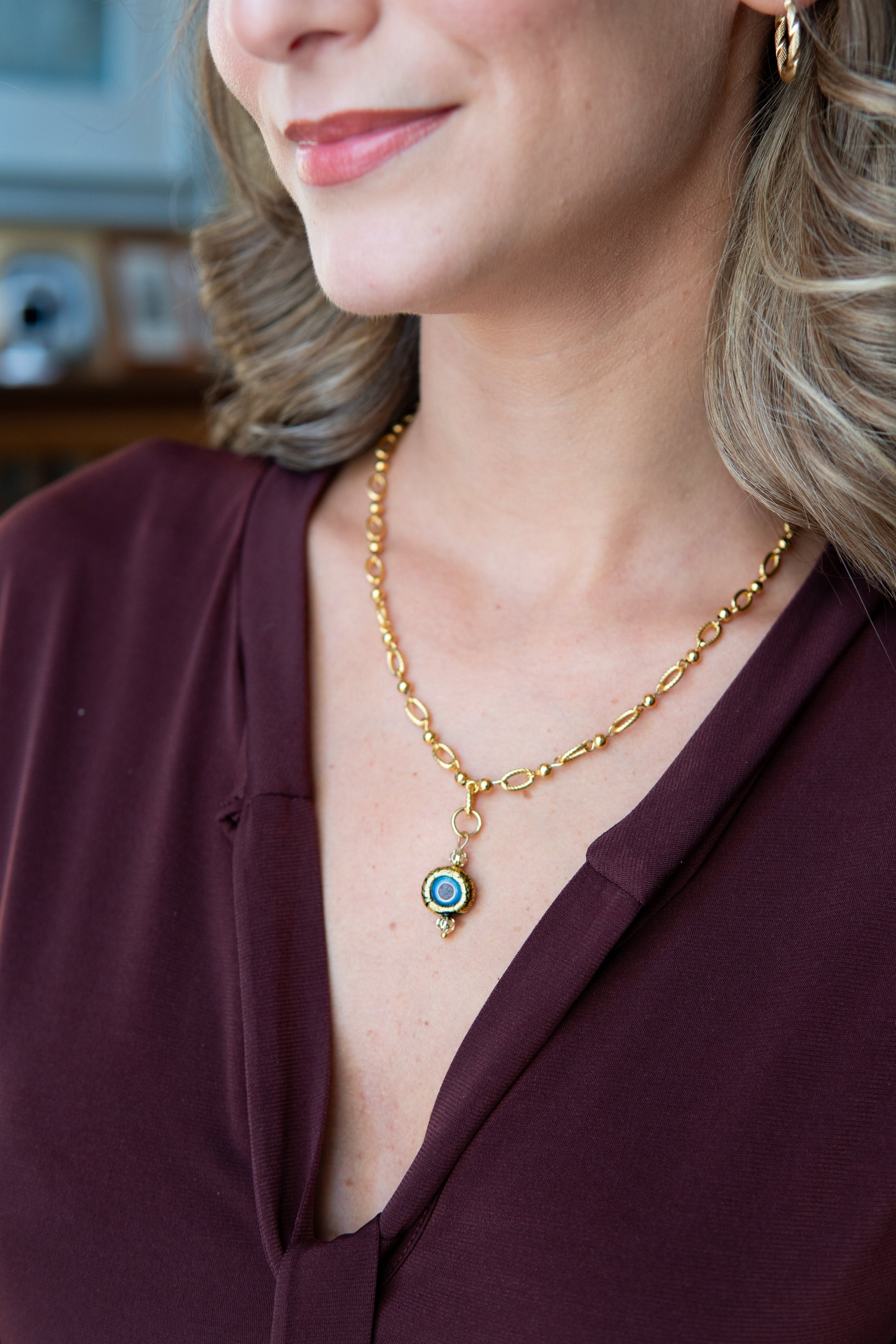 Collana Òcièto dorato. Òcièto, occhietto, è un nome affettuoso per una collana dal fascino prezioso e incantevole. La catena dorata, finemente lavorata, accoglie una perla con murrina circondata da foglia oro, capace di catturare lo sguardo con la sua luminosità. Un gioiello che si indossa con leggerezza, ma che sa impreziosire ogni look: da una scollatura essenziale ad un maglione a collo alto, fino alla pelle nuda.