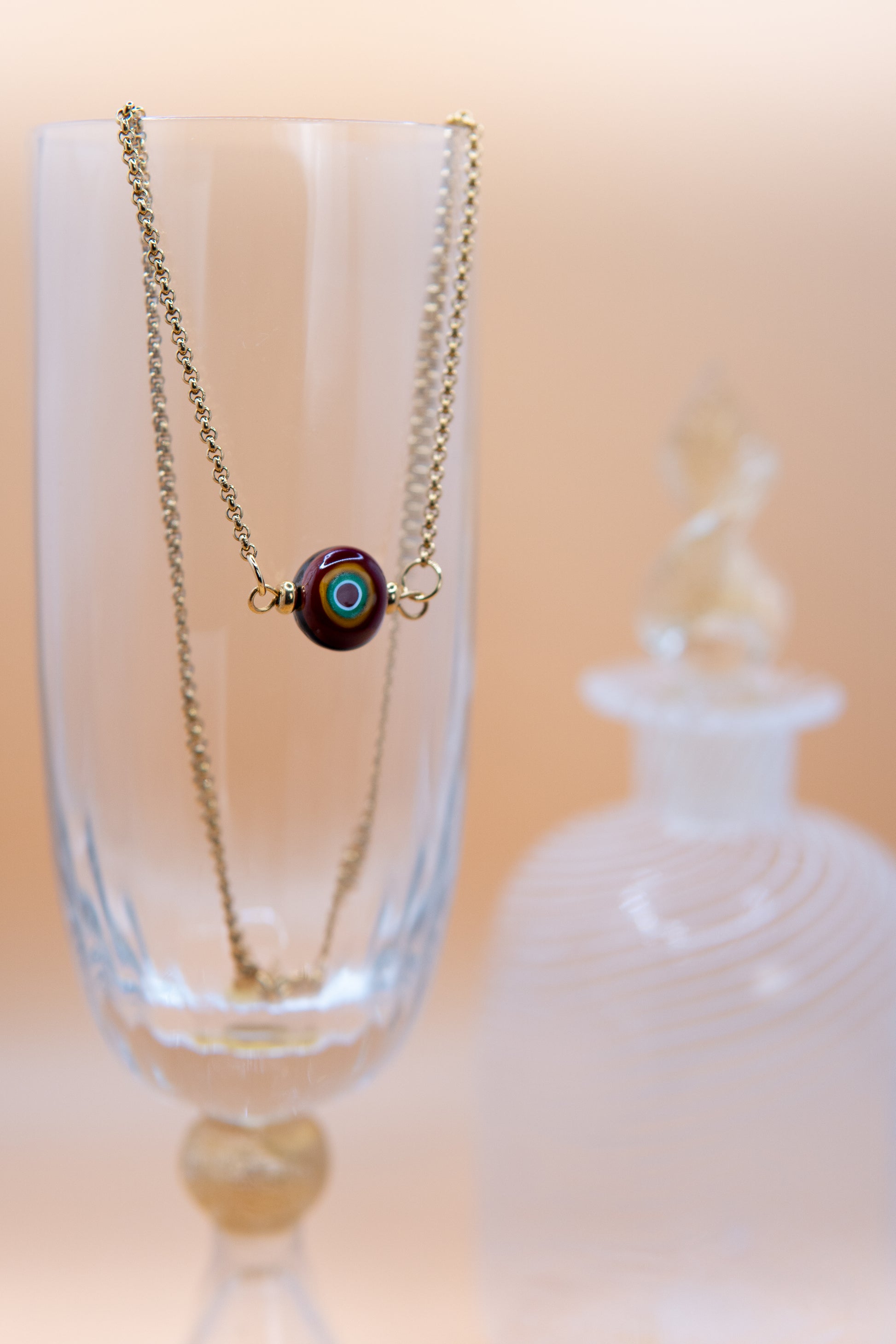 Collana Òcièto Rosso. Òcièto, occhietto, è un nome affettuoso per una collana dal fascino discreto. La catenina dorata, sottile e luminosa, è incorniciata da una perlina che cattura pur nella sua semplicità. Un gioiello che si indossa con leggerezza, che si lascia notare anche su una scollatura semplice, un maglione girocollo o un collo nudo, come un dettaglio silenzioso ma capace di attirare lo sguardo al momento giusto.