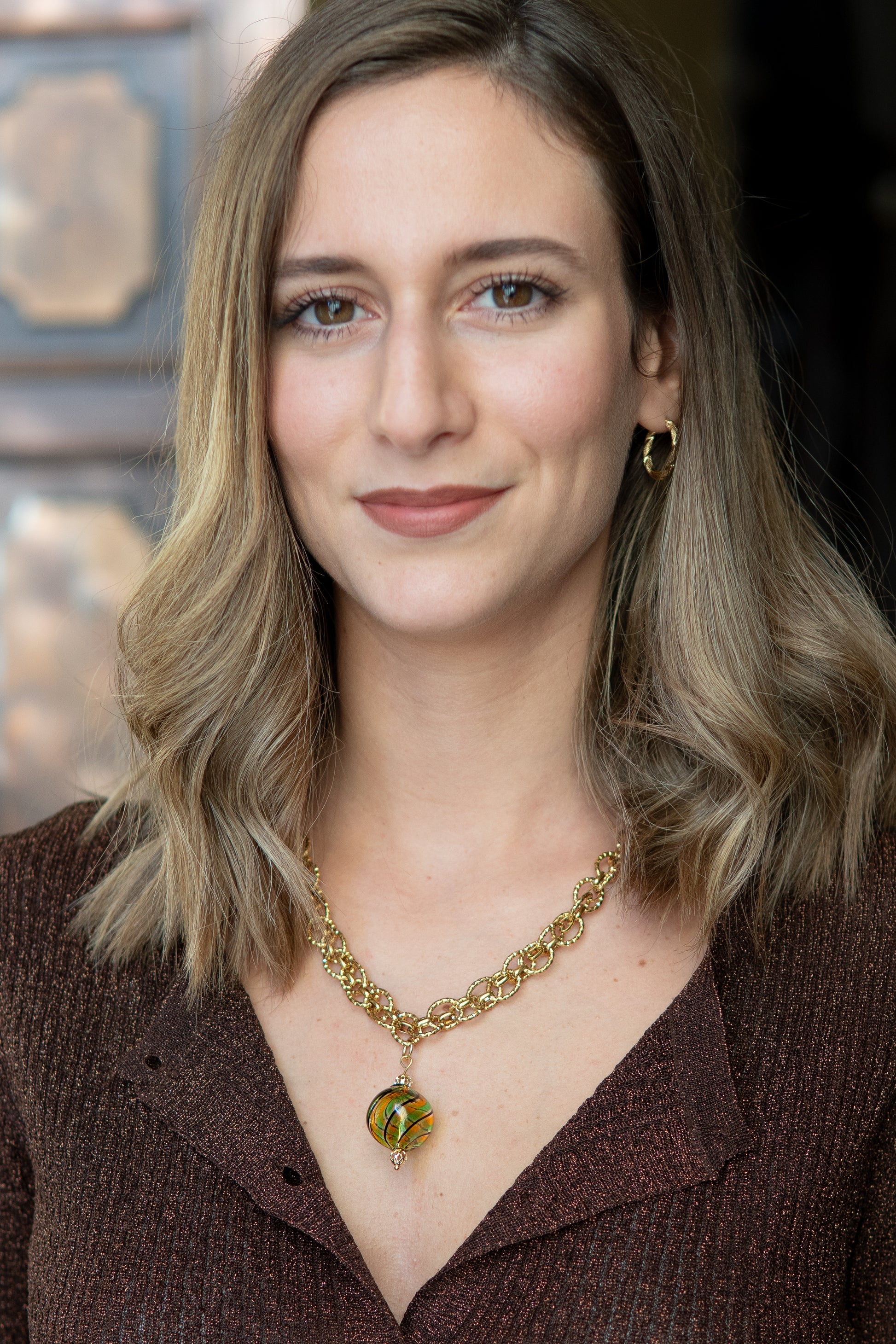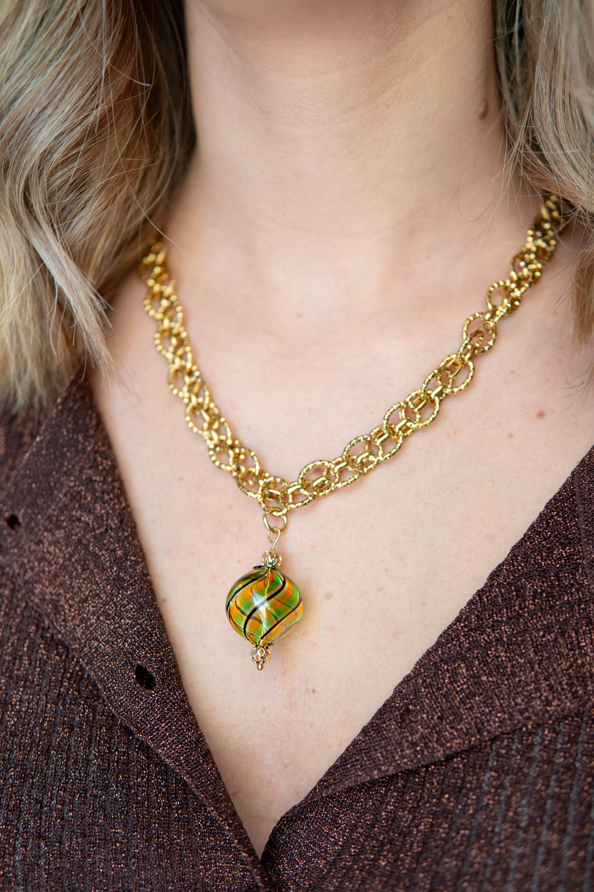 Collana Sófio de Mar. Sófio de Mar, Soffio di mare, è un pezzo dal carattere deciso e luminoso. La catena dorata è composta da maglie larghe e intrecciate, con un effetto ricco e strutturato che cattura la luce a ogni movimento. Al centro, il pendente in vetro soffiato è il vero protagonista: una perla dalla forma leggermente tondeggiante e irregolare, tipica della lavorazione artigianale veneziana. I colori, sfumature di ambra, verde e nero, si intrecciano in striature morbide che ricordano le trasparenze dell’acqua e i riflessi del sole sul mare. Il pendente è rifinito da piccoli dettagli dorati che ne completano l’eleganza e ne esaltano la preziosità. Indossata, questa collana diventa un elemento forte ma armonioso, perfetto per dare personalità anche ai look più semplici.
