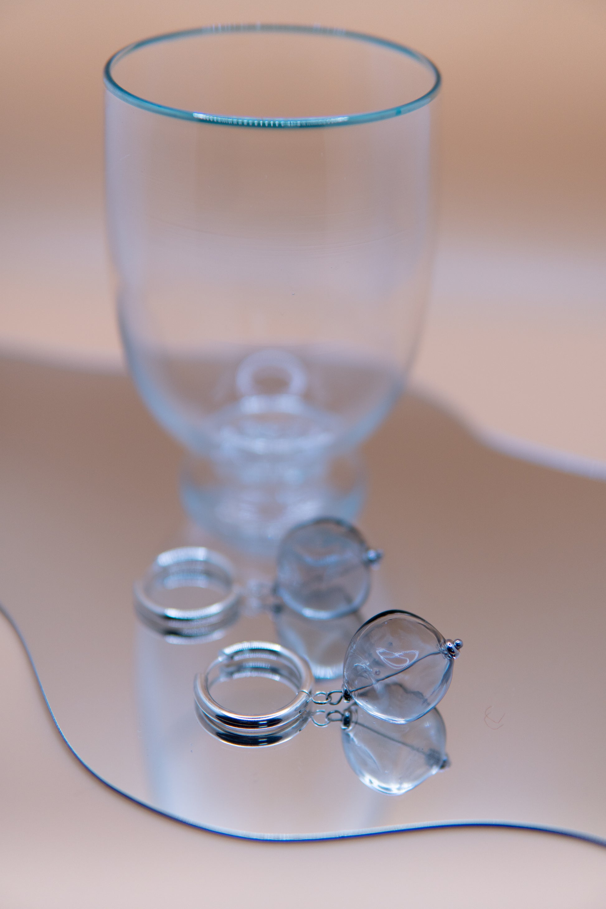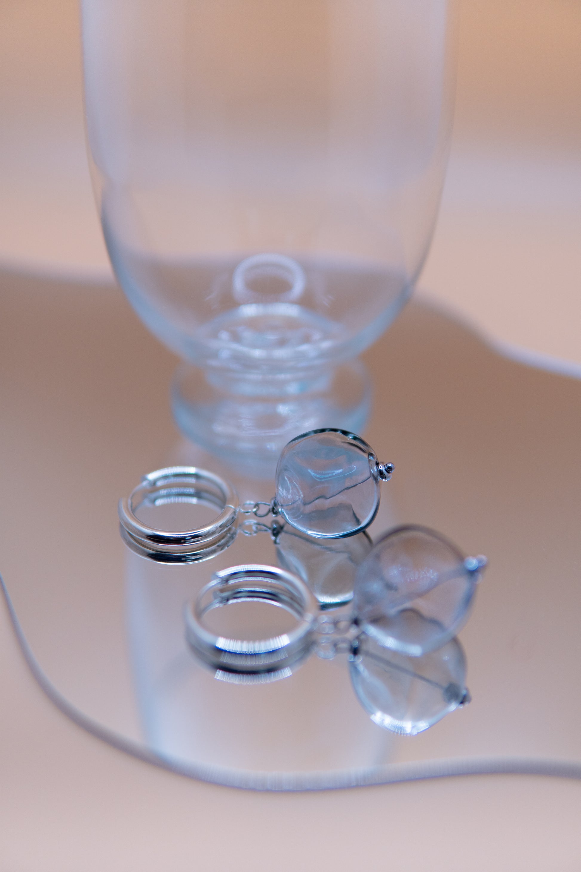 Orecchini Sòfio de Mar. Sòfio de Mar, “soffio di mare”, è un paio di orecchini che racchiude tutta la magia del vetro soffiato veneziano. Ogni elemento è una piccola scultura d'aria e luce: una perla soffiata, trasparente e delicata nel suo grigio tenue, attraversata da giochi interni di colore rendono ogni pezzo unico ed irripetibile. La forma morbida e leggermente irregolare racconta la spontaneità del gesto artigianale, mentre i riflessi del vetro catturano la luce ad ogni movimento. Il tutto è sospeso su un elegante cerchio argentato, luminoso e leggero, che incornicia il viso con equilibrio e modernità. Un gioiello che non passa inosservato e che può essere abbinato sia ad outfit casual che eleganti, aggiungendo sempre un tocco di ricercata semplicità.
